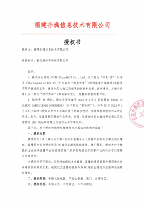 福建撲滿信息技術(shù)有限公司注冊(cè)地位于福建省福州市,是國(guó)內(nèi)《熱血傳奇》客戶端游戲獨(dú)占性版權(quán)人。對(duì)《熱血傳奇》客戶端游戲擁有全部版權(quán),并有權(quán)基于版權(quán)權(quán)利進(jìn)行該游戲維權(quán)。株式會(huì)社傳奇IP (以下簡(jiǎn)稱(chēng)傳奇IP )對(duì)《The Legend of Mir 2》(中文名為“熱血傳奇"、或“傳奇”、“傳奇2”、“MIR II”)游戲(以下稱(chēng)為 “授權(quán)作品”) 共同享有充分、完整且有效的著作權(quán)。經(jīng)傳奇IP授權(quán) , RENAISSANCE INVESTMENT MANAGEMENT LIMITED (以下簡(jiǎn)稱(chēng) RENAISSANCE Ltd.)有權(quán)在中國(guó)大陸地區(qū)獨(dú)占性地對(duì)授權(quán)作品的網(wǎng)絡(luò)客戶端游戲進(jìn)行開(kāi)發(fā)、 發(fā)行、管理、宣傳、推廣和運(yùn)營(yíng),針對(duì)授權(quán)作品的侵權(quán)游戲及侵權(quán)方,RENAISSANCE Ltd.有權(quán)采取必要的措施,并有權(quán)將前述權(quán)利分授權(quán)給第三人。福建撲滿信息技術(shù)有限公司經(jīng)RENAISSANCE Ltd.授權(quán),獲得上述權(quán)利,有權(quán)在中國(guó)大陸地區(qū)獨(dú)占性地對(duì)授權(quán)作品的網(wǎng)絡(luò)客戶端游戲進(jìn)行開(kāi)發(fā)、發(fā)行、管理、宣傳、推廣和運(yùn)營(yíng),并有權(quán)對(duì)侵權(quán)行為/主體采取維權(quán)措施。